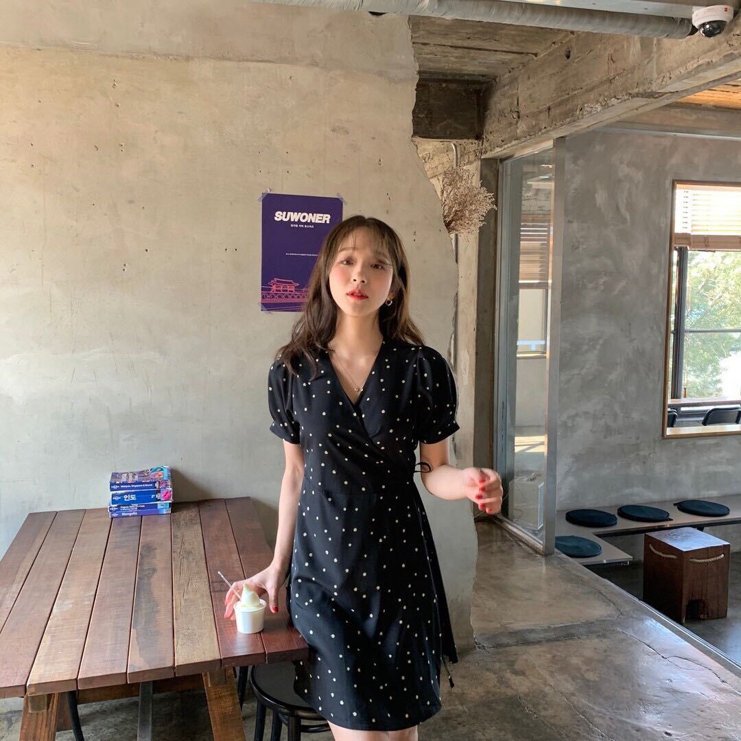 サマースタンダードウェストワンピースフローラルVネックドレス レトロ 夏物 花柄 左左右右1051754