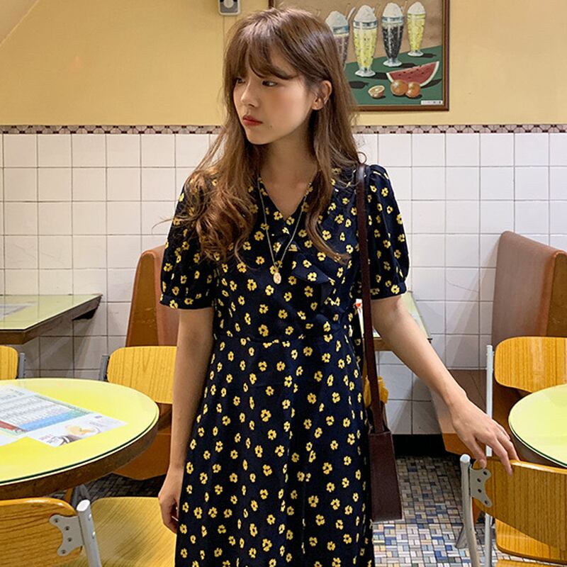 サマースタンダードスカート ウェストスリム薄手ロングドレス レトロ 夏物 フラワーデザイン 左左右右8922257