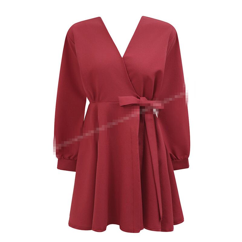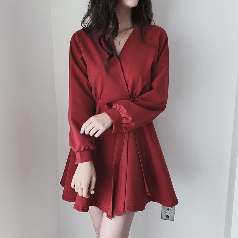 スタンダードレッドスカート ソリッド カラーウェストVネックドレス レトロ ソリッドカラー 左左右右2129533