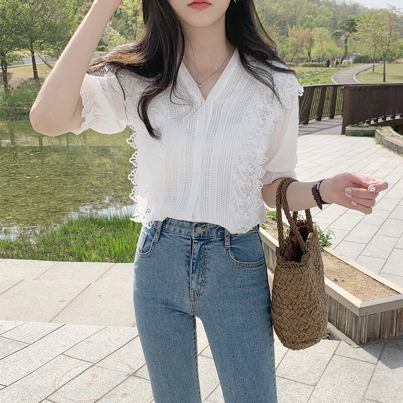 サマースタンダードホワイトシャツ レースVネック レトロ 夏物 左左右右2737380
