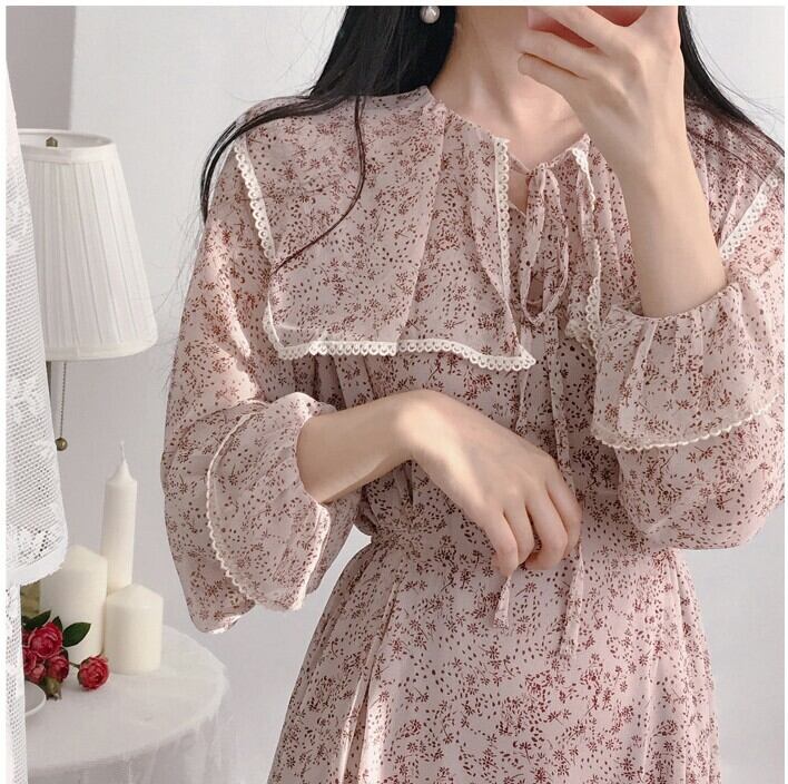 スプリングスタンダードスカート ウェストネイビーカラーフローラルシフォンドレス ロング レトロ 春物 花柄 左左右右4334383