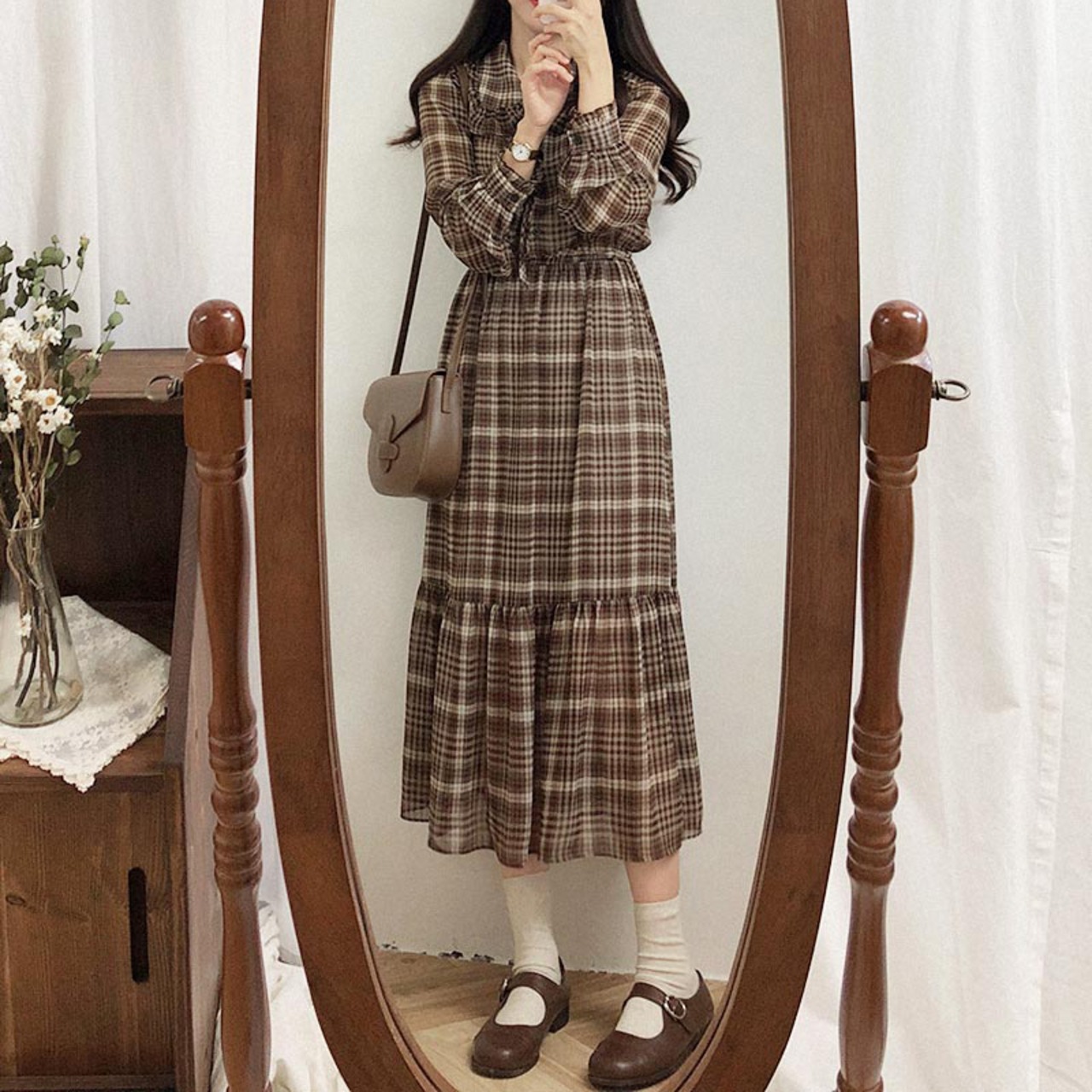 スプリングスタンダードスタイルスカート ロング格子柄ドレス レトロ 春物 フラワーデザイン 左左右右0441538