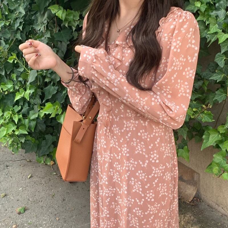 スタンダードスカート ロング長袖スリーブシフォンVネックドレス ピンク レトロ 左左右右7373554