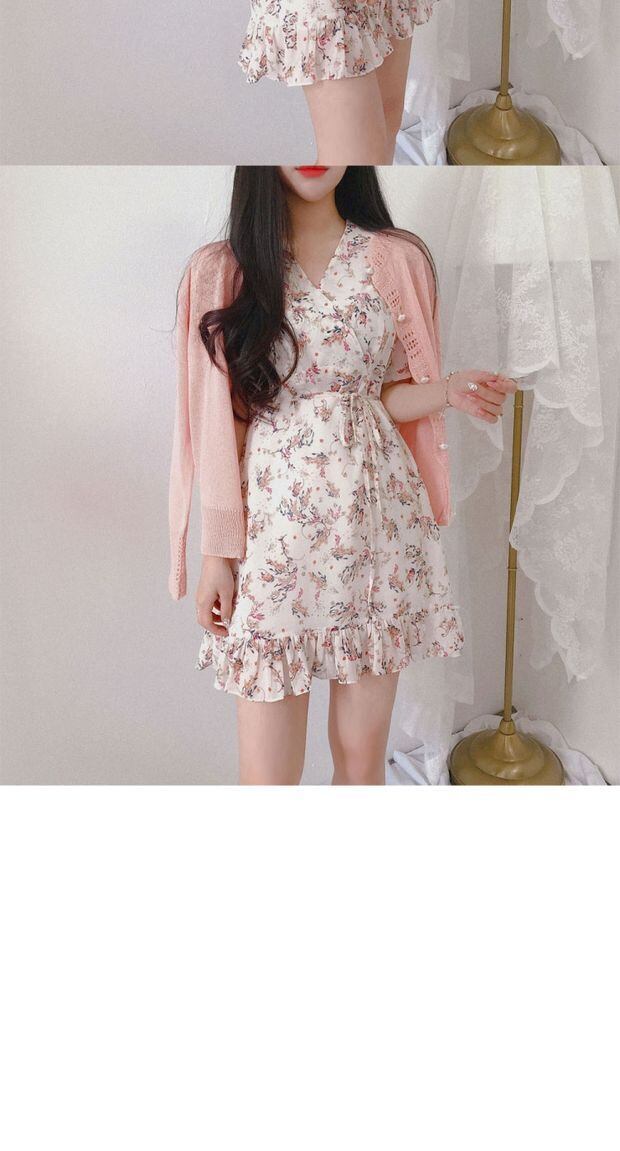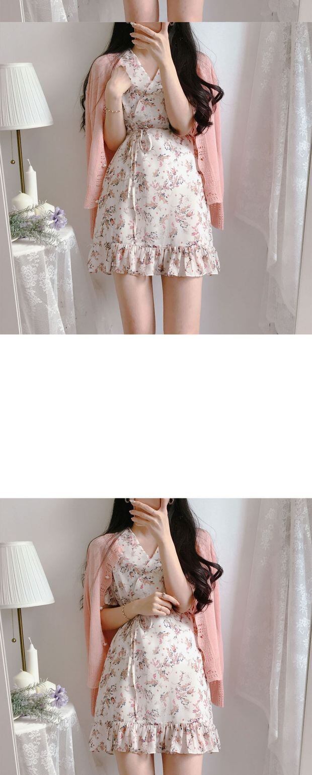 スタンダードスカート Vネックレースウェストシフォンフローラルドレス レトロ 花柄 レースアップ 左左右右7384515