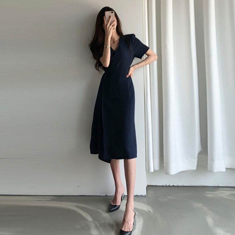 サマースタンダードVネックウェストサイドドレス レトロ 夏物 ICC_レディース9766583