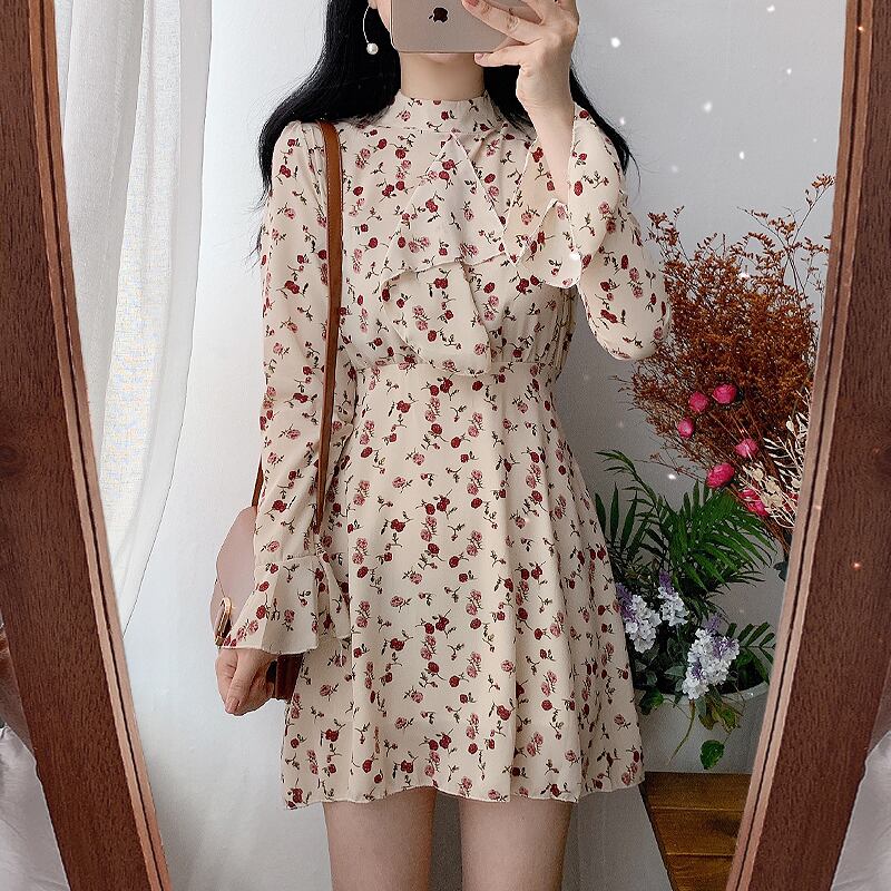 スプリングオータムスタンダードスカート フローラルシフォンドレス レトロ 大人ガーリー スウィート キュート カジュアル 春物 秋物 花柄 左左右右1953929
