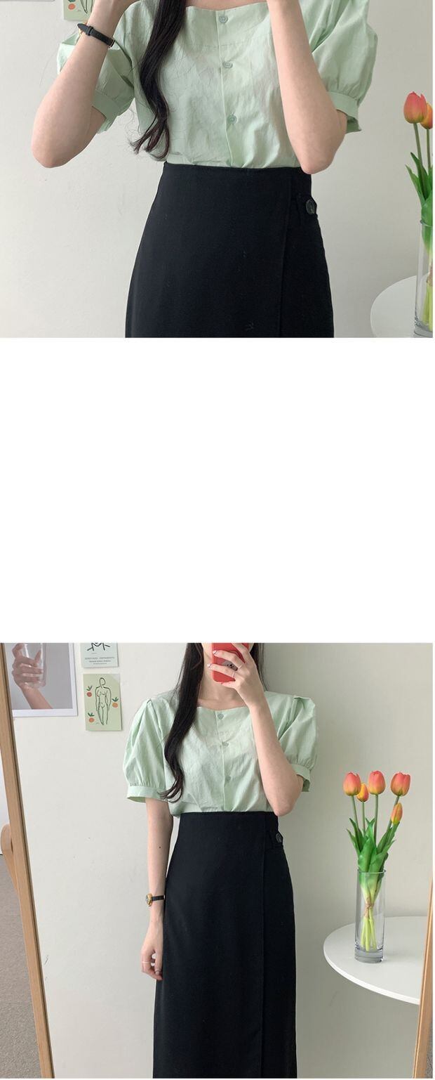 色:ホワイトトップ,グリーントップ,黄色のシャツ,黒スカート,カーキ色のスカート