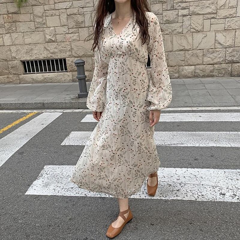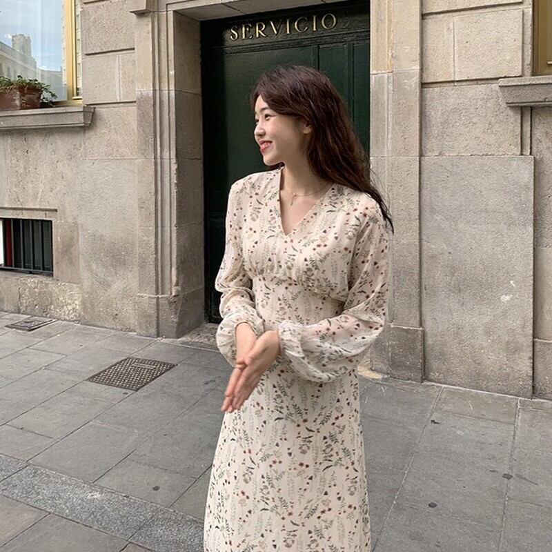 スプリングオータムスタンダードスカート スリムハイウェストウェストフローラルVネックシフォンドレス レトロ 春物 秋物 花柄 フラワーデザイン 左左右右8800164