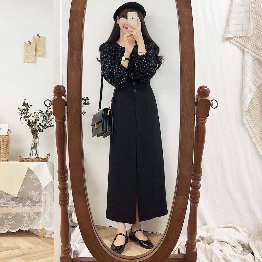 スタンダードブラックスカート ロングハイウェストウェスト レトロ ステッチ 左左右右5939494