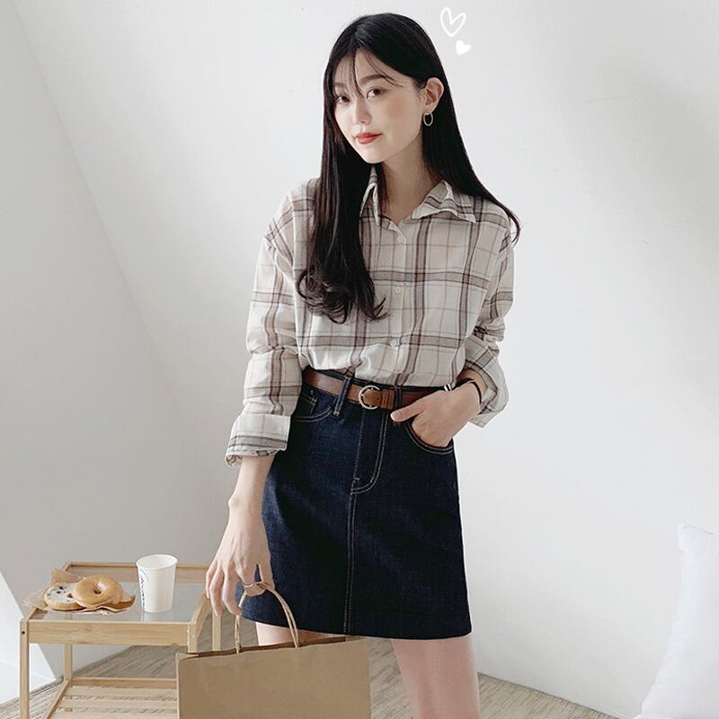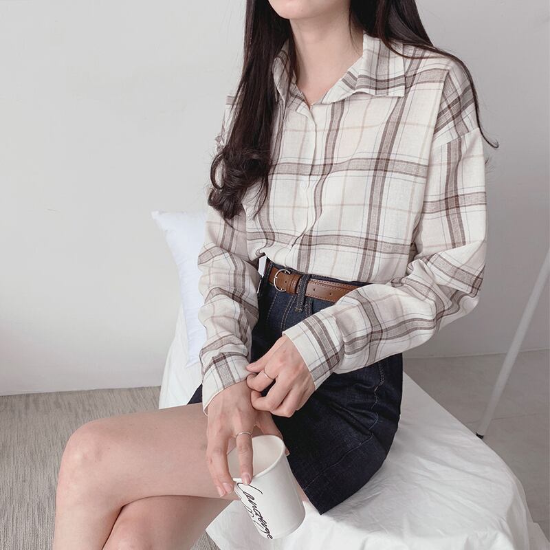 春と秋の香港スタイルのレトロシックなシャツカーディガン野生のシンプルな学生のポロの襟は薄い格子縞のシャツの女性でした スプリング 春物 オータム 秋物 左左右右_复古定制2989663