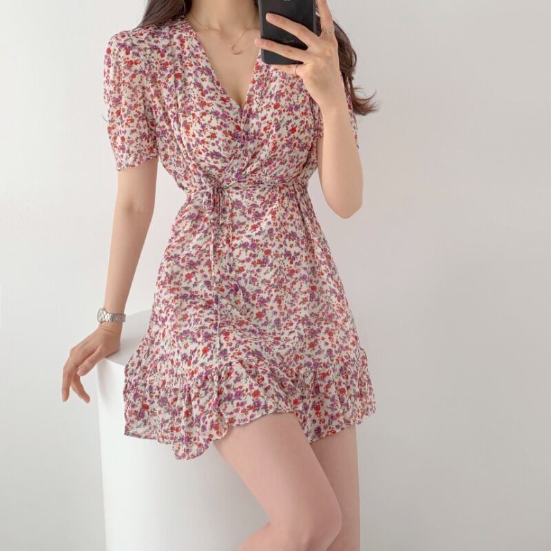 フローラルホワイトVネックストラップ ウェストシフォンドレス 花柄 ICC_レディース0720755