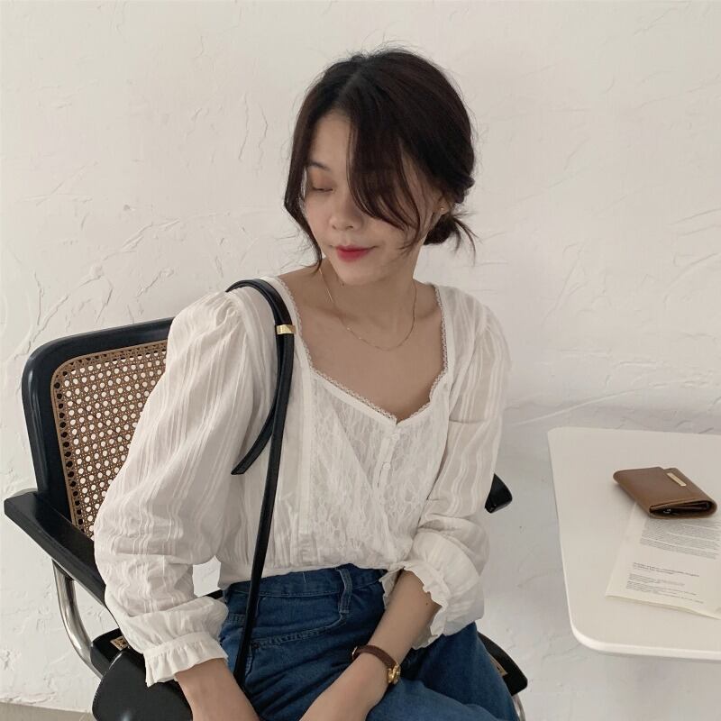 VネックレースFlowerデザイン ショートシャツ フラワーデザイン ステッチ ICC_レディース3270857