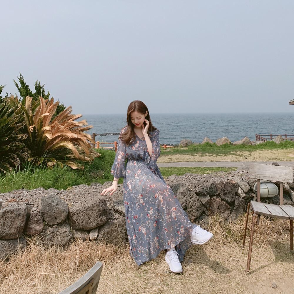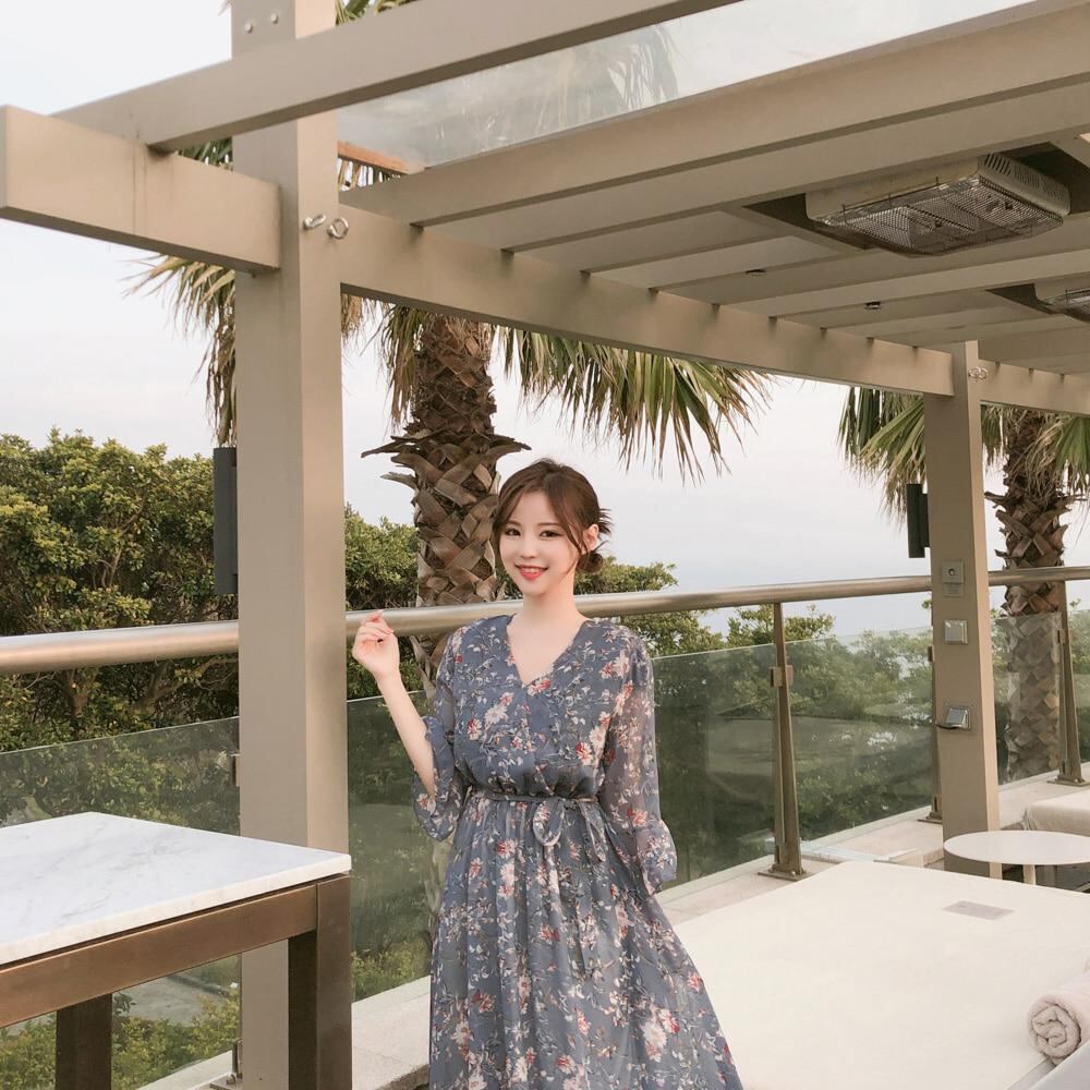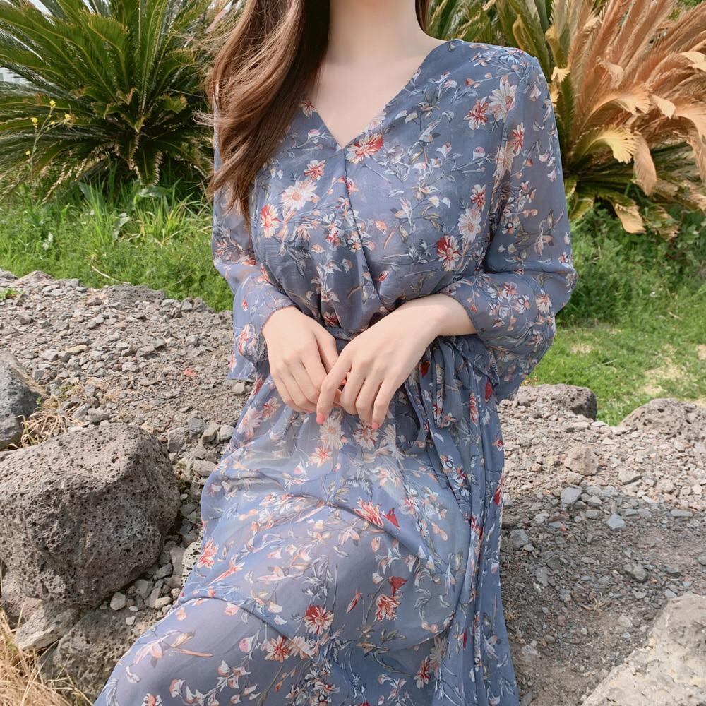 サマースタンダードスカート ロングフローラルVネックシフォンドレス レトロ 夏物 花柄 左左右右7564496