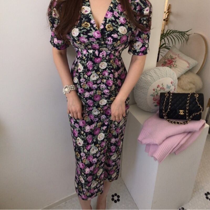 サマースタンダードVネックFlowerデザイン スリム薄手半袖スリーブドレス ショート レトロ レース ハーフスリーブ エレガント 夏物 レースアップ フラワーデザイン ICC_レディース1732676