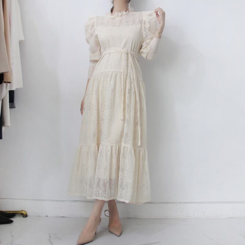 レーススタイルスタンドカラーカラーFlowerデザイン ハイウェストウェストストラップ スリーブドレス ロングスカート エレガント フラワーデザイン ICC_レディース1828049