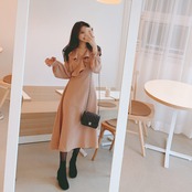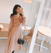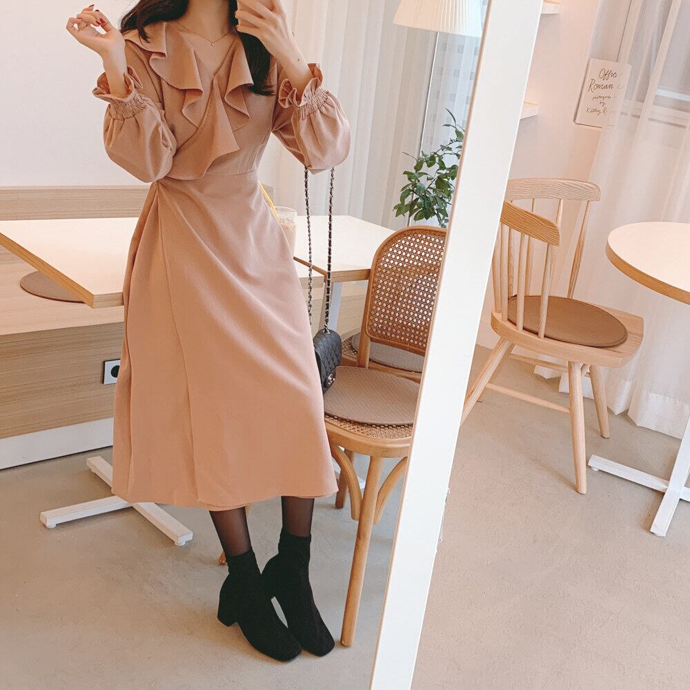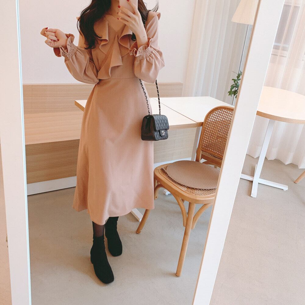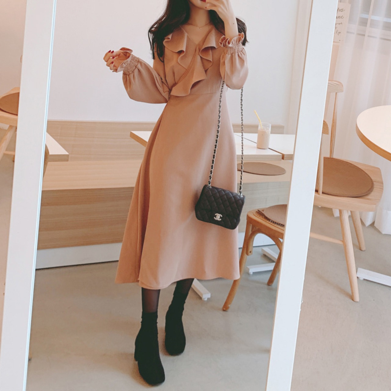 スプリングオータムソリッド カラースカート スタイル薄手Vネックドレス 大人ガーリー スウィート キュート カジュアル 春物 秋物 ソリッドカラー 左左右右5929195