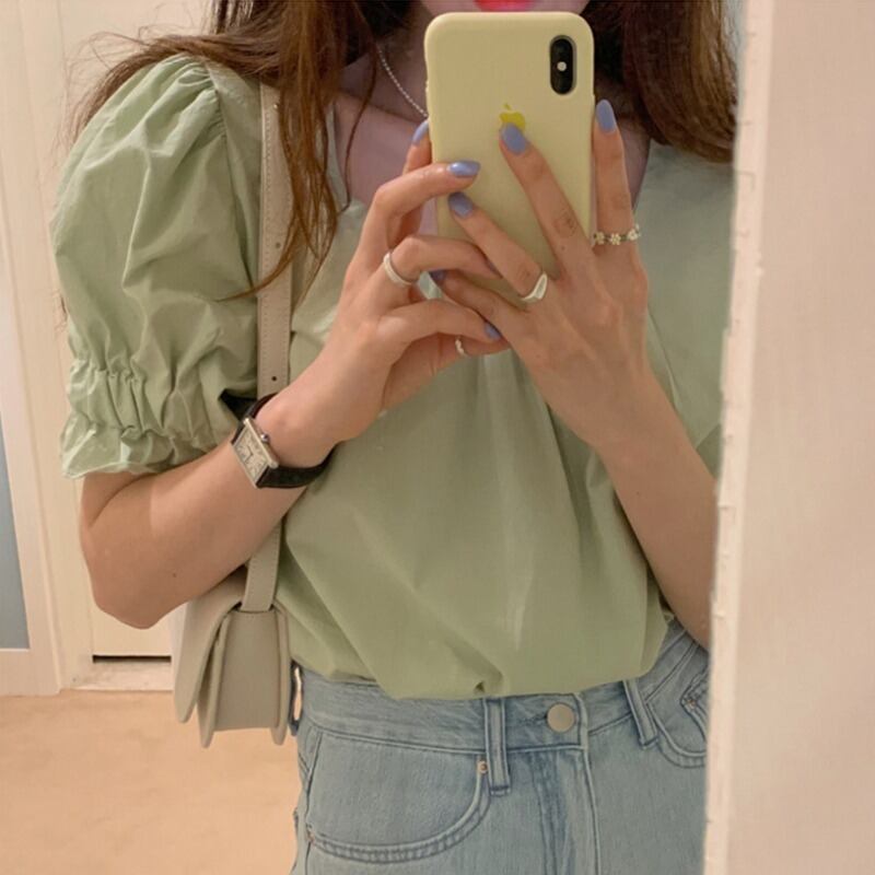 スタンダードラウンドネックルーズソリッド カラープリーツスリーブ半袖シャツ レディース ショート レトロ ハーフスリーブ Oネック ソリッドカラー ICC_レディース0324352