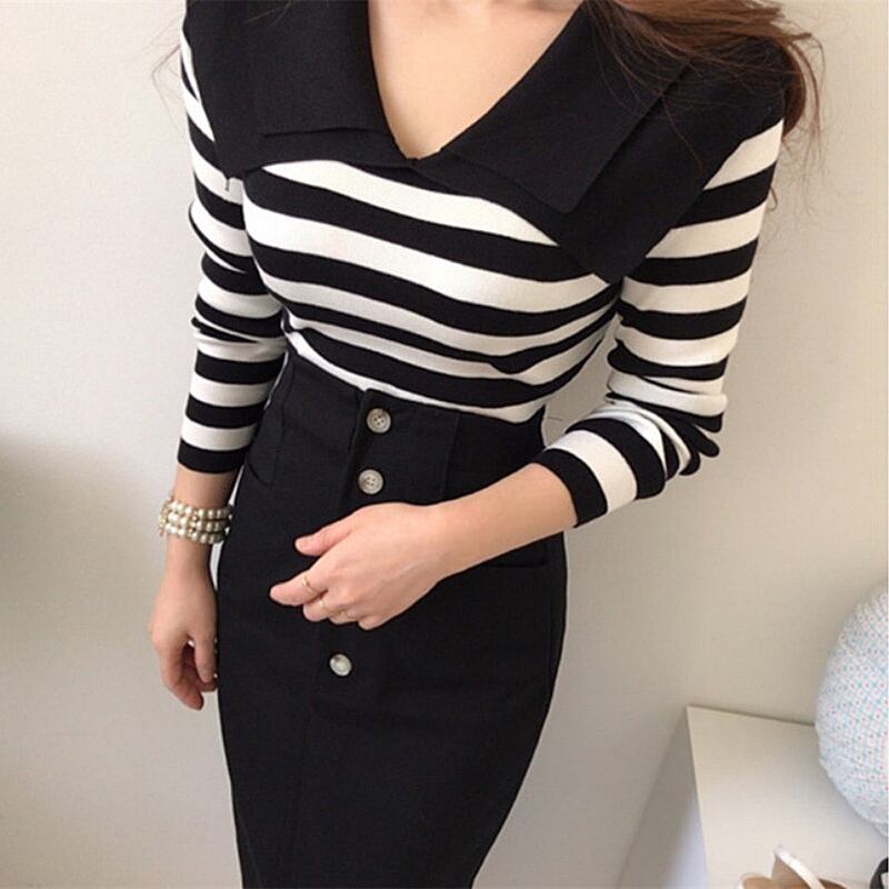 スプリングネイビーカラーブラックホワイトストライプスリムセーター レディース ロング 春物 ICC_レディース9018664