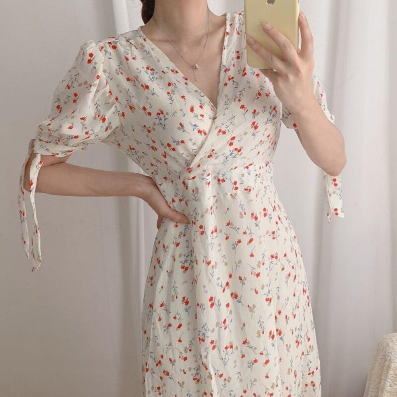 サマーフローラルVネック薄手ハイウェストウェストスリーブシフォンドレス ロングスカート レース 大人ガーリー スウィート キュート カジュアル 夏物 花柄 レースアップ ICC_レディース7924120