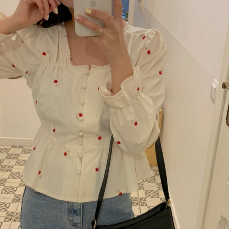 スプリングサマーシャツ 刺繍Flowerデザイン ウェストショートカラートップス 大人ガーリー スウィート キュート カジュアル 春物 夏物 フラワーデザイン スクウェア ICC_レディース4828894