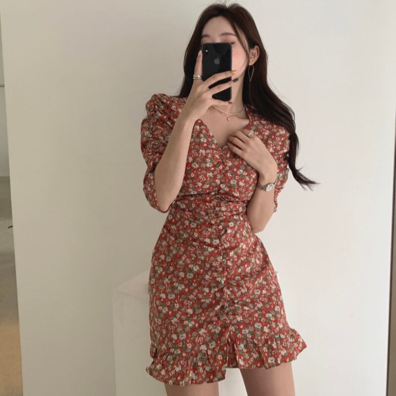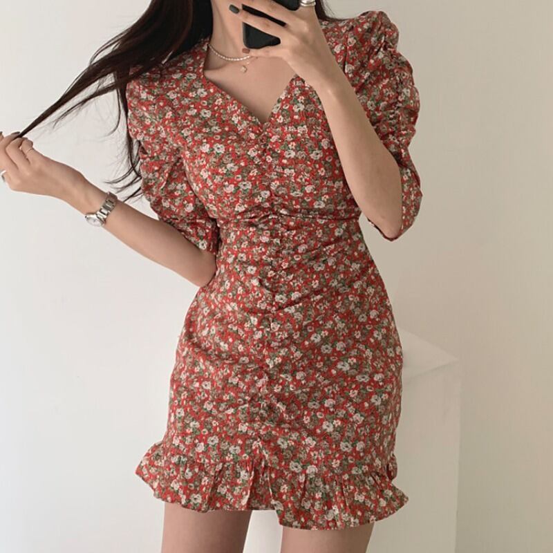 サマースタンダードスタイルVネックウェストスリーブシフォンフローラルドレス レディース レトロ レース 夏物 花柄 ICC_レディース0519111