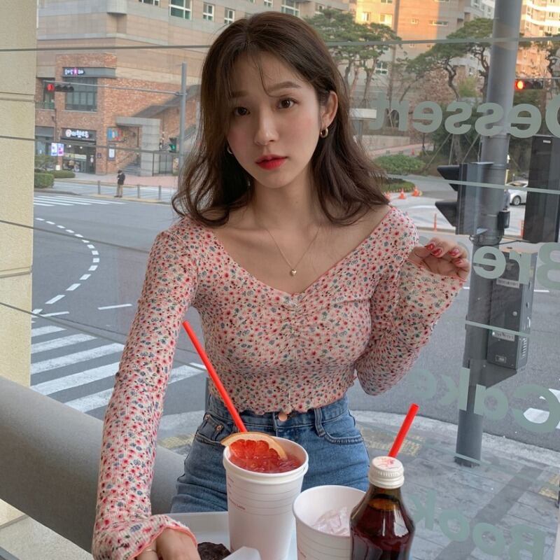 スプリングサマーVネックプリーツフローラルスリムTシャツ トップス ショート ロング 春物 夏物 花柄 ICC_レディース3834621