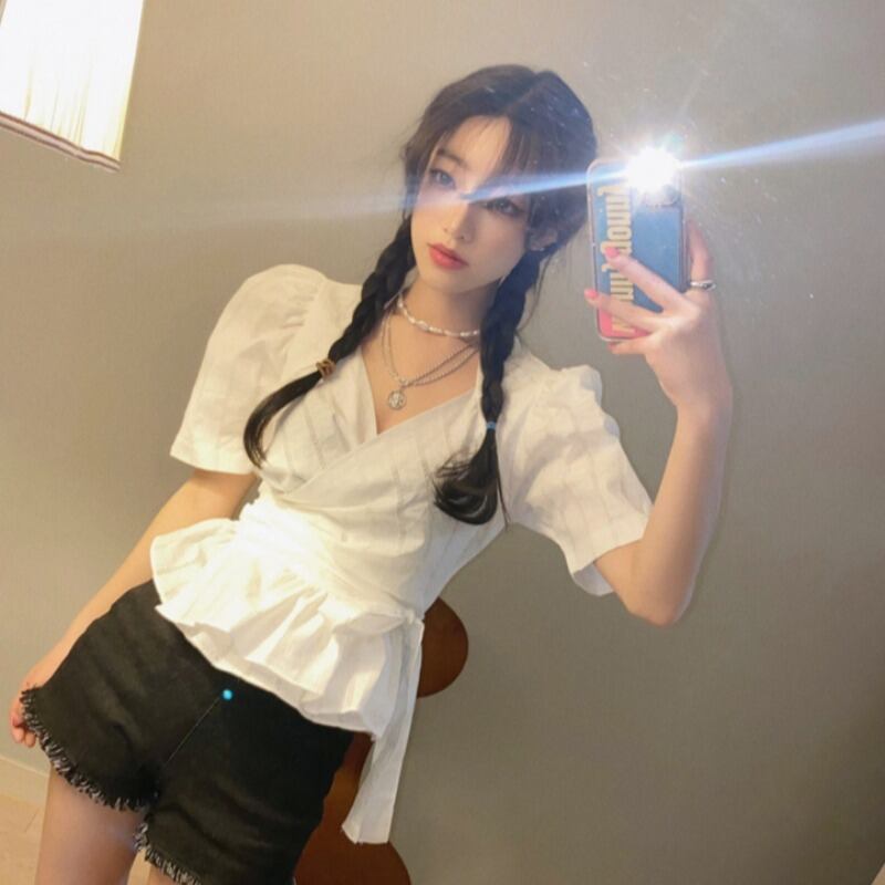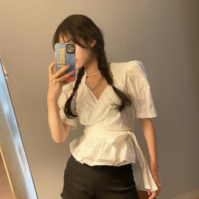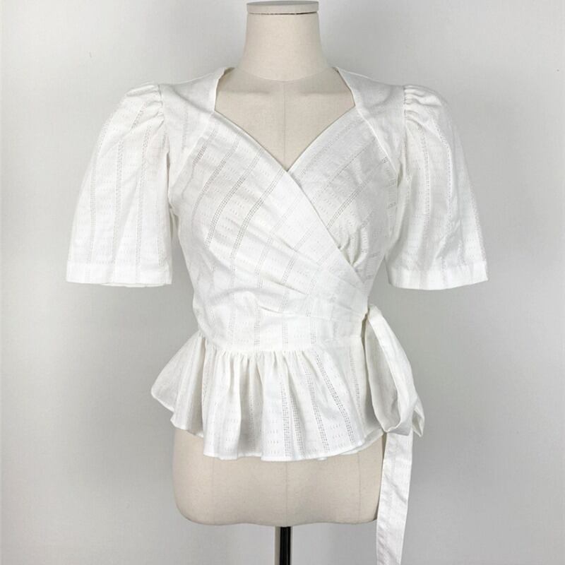 スタンダードスタイルVネッククロスストラップ ウェストラッフルワンピースシャツ レトロ レース ICC_レディース8686681