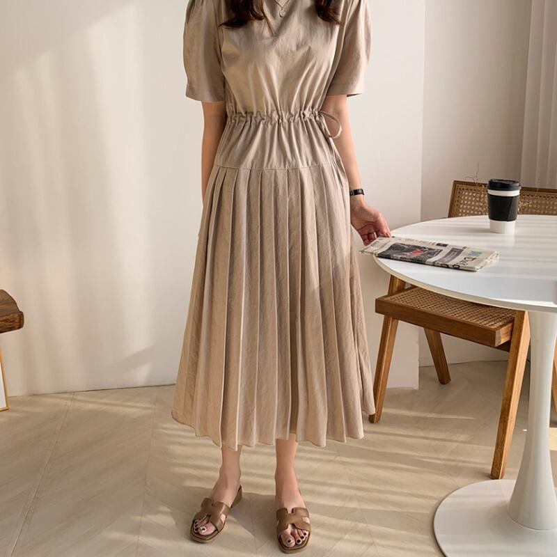 サマーラウンドネックギャザーレースウェストスリーブプリーツドレス ロングスカート 夏物 Oネック ICC_レディース6182459