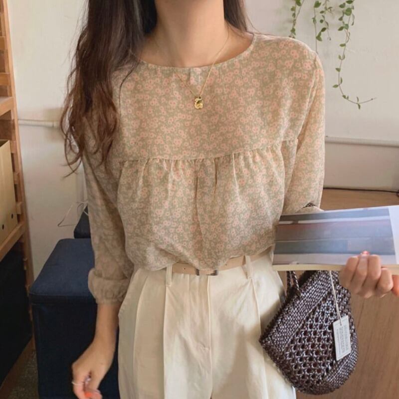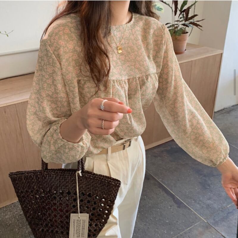 ホワイトフローラルラウンドネックプルオーバー ルーズ長袖スリーブシフォンシャツ トップス ロング 花柄 Oネック ICC_レディース2271440