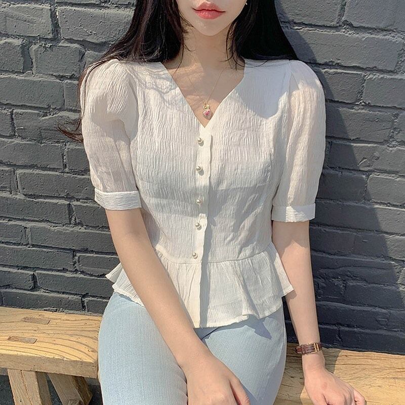 Vネックパールバックルプリーツウェストスリーブストライプシャツ 真珠 ICC_レディース8688079