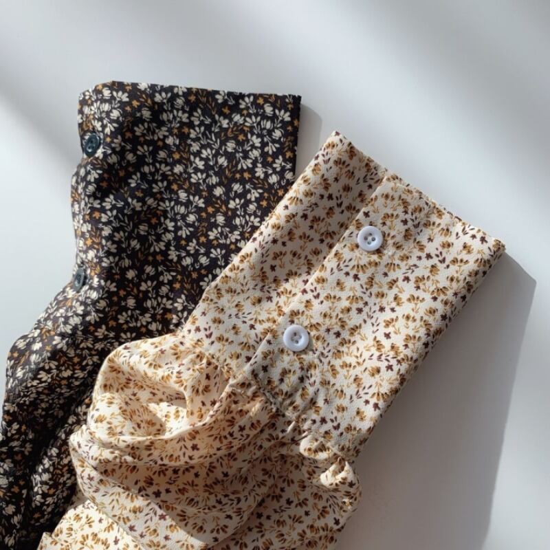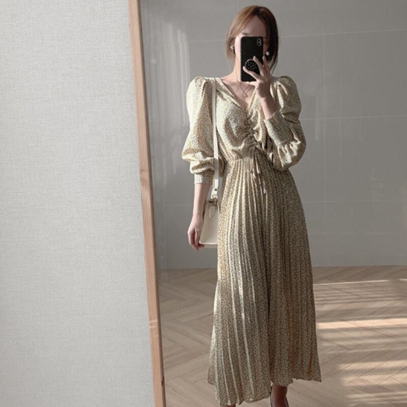 スプリングVネックフローラルギャザーレーススリーブシフォンプリーツドレス ロングスカート 春物 花柄 ICC_レディース1382214