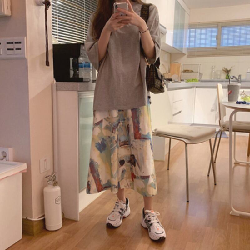 ラウンドネックルーズTシャツ ハイウェストウェスト薄手スカート レディース Oネック ICC_レディース7829134