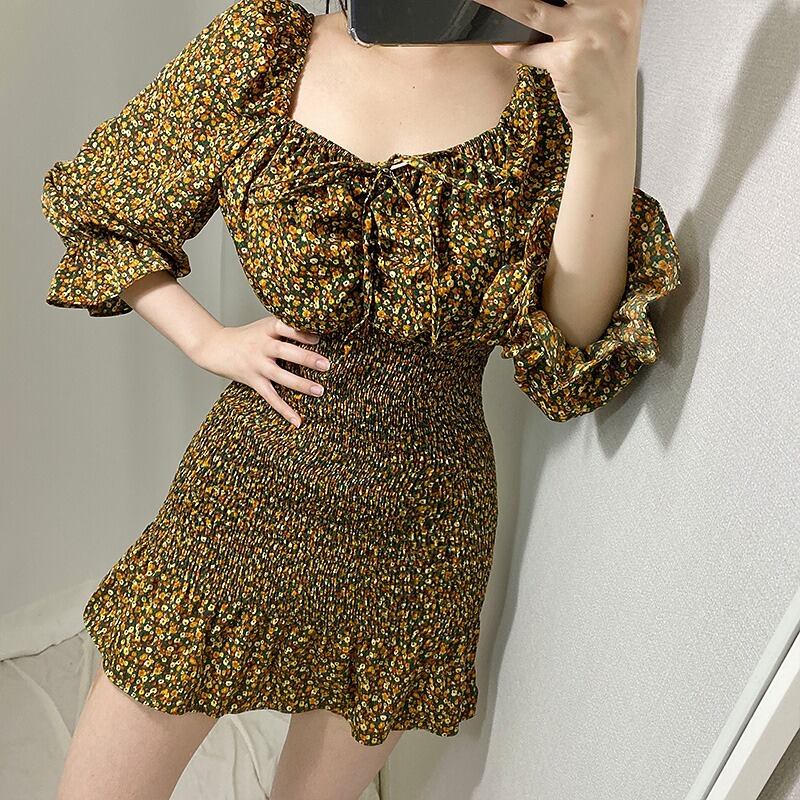 スプリングサマーストラップレススタンダードフローラルショートスカート ウェストドレス レトロ 春物 夏物 花柄 ICC_レディース1069912