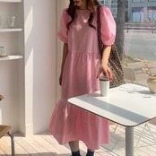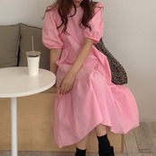 サマースタンダードスリーブスカート ハイウェストウェスト薄手ロングドレス ピンク レトロ 夏物 ICC_レディース8756430