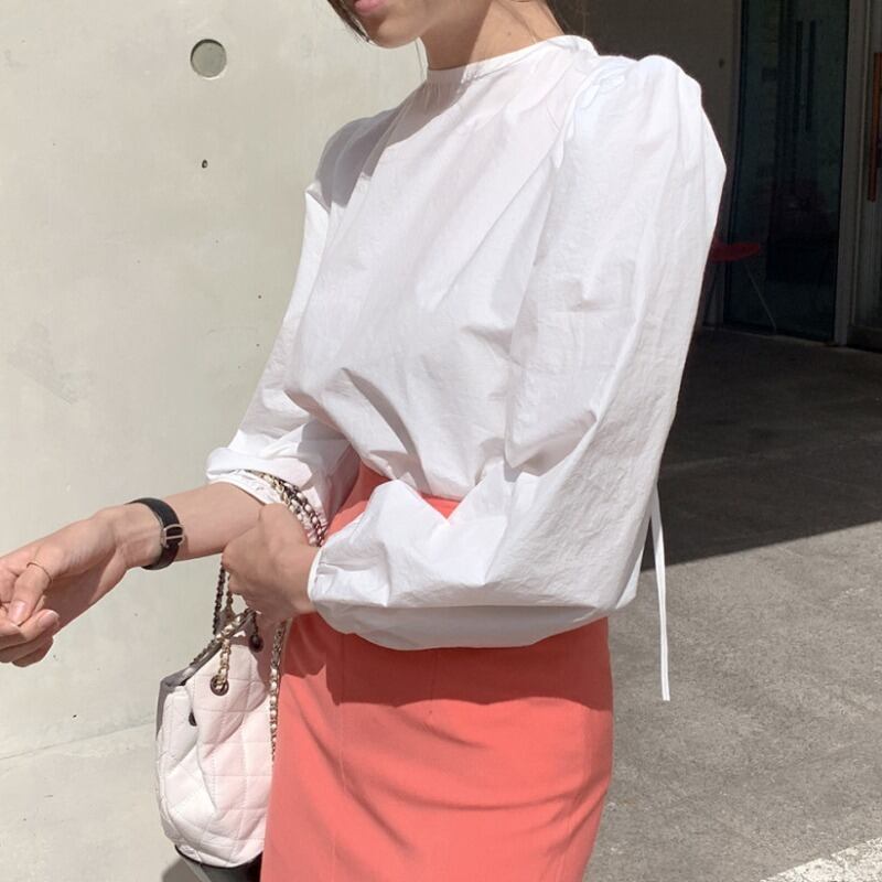 ラウンドネックルーズバックソリッド カラースリーブシャツ レディース リボン Oネック ソリッドカラー ICC_レディース1112533