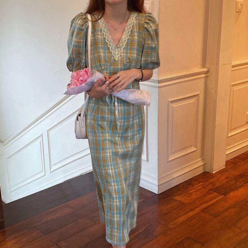 グリーン格子柄ドレス スプリングサマーVネックスリーブスカート スタンダード薄手 レトロ 春物 夏物 フラワーデザイン ICC_レディース1135756
