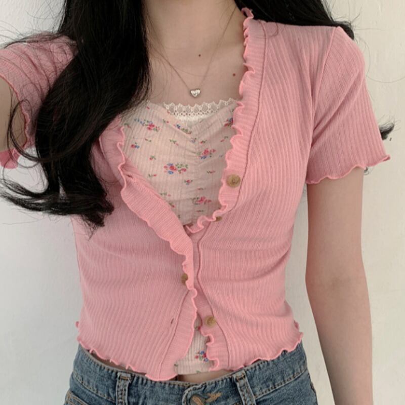 スタンダードスタイルスリムVネックシャツ ニットカーディガンショートTシャツ サマー レトロ 大人ガーリー スウィート キュート カジュアル 夏物 ICC_レディース3223055