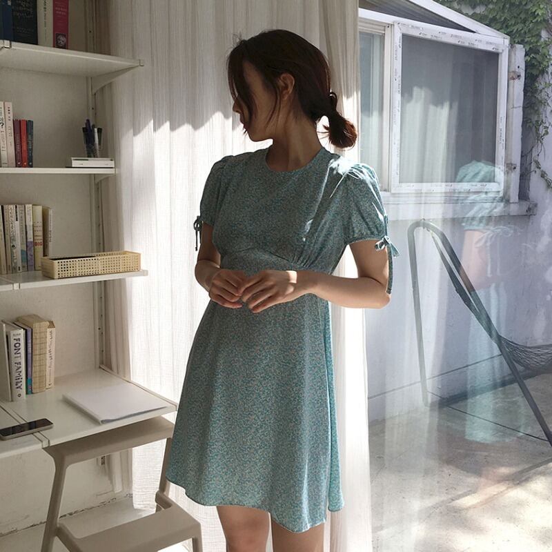 ラウンドネックリボンレーススリーブハイウェストウェスト薄手ショートフローラルドレス レディース 花柄 Oネック ICC_レディース3071062