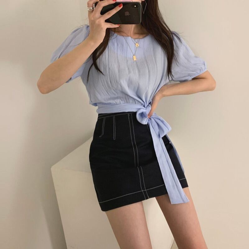サマーソリッド カラーラウンドネックショートシャツ スリムスカート 夏物 Oネック ソリッドカラー ICC_レディース6544196