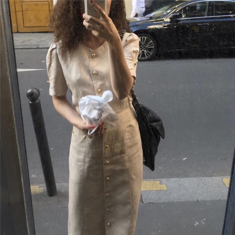 サマーソリッド カラーハイウェストウェスト薄手スタンダードラウンドネック半袖スリーブドレス レディース ショート レトロ ハーフスリーブ 大人ガーリー スウィート キュート カジュアル 夏物 Oネック ソリッドカラー ICC_レディース9820647