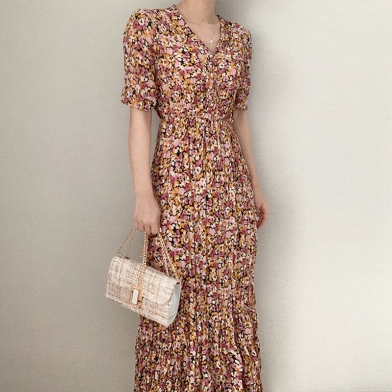 サマーストレッチウェストプリーツフローラルドレス スカート エラスティック 伸縮 夏物 花柄 ICC_レディース3941009