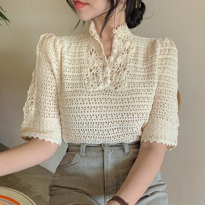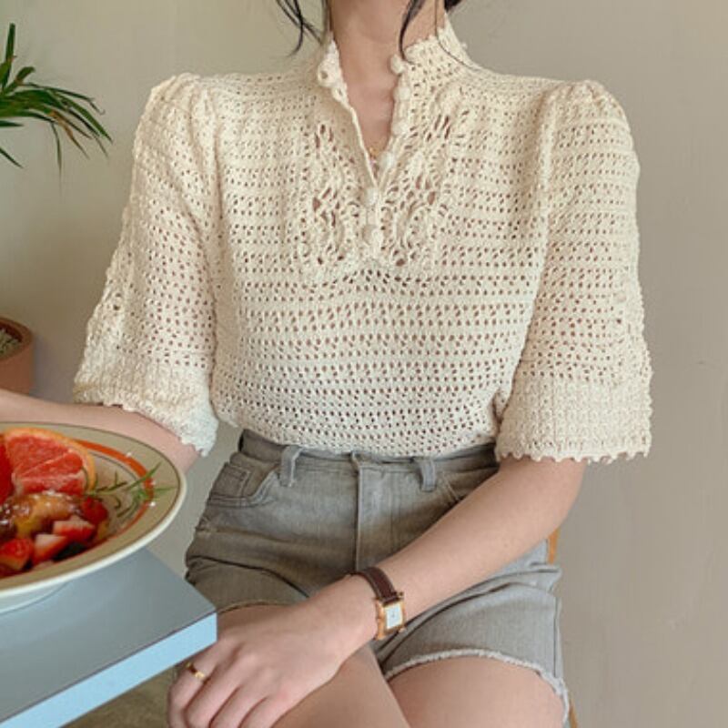 スタンダードスタンドカラーカラーFlowerデザイン ソリッド スリーブレースシャツ Tシャツ レトロ エレガント ソリッドカラー フラワーデザイン ICC_レディース0169656