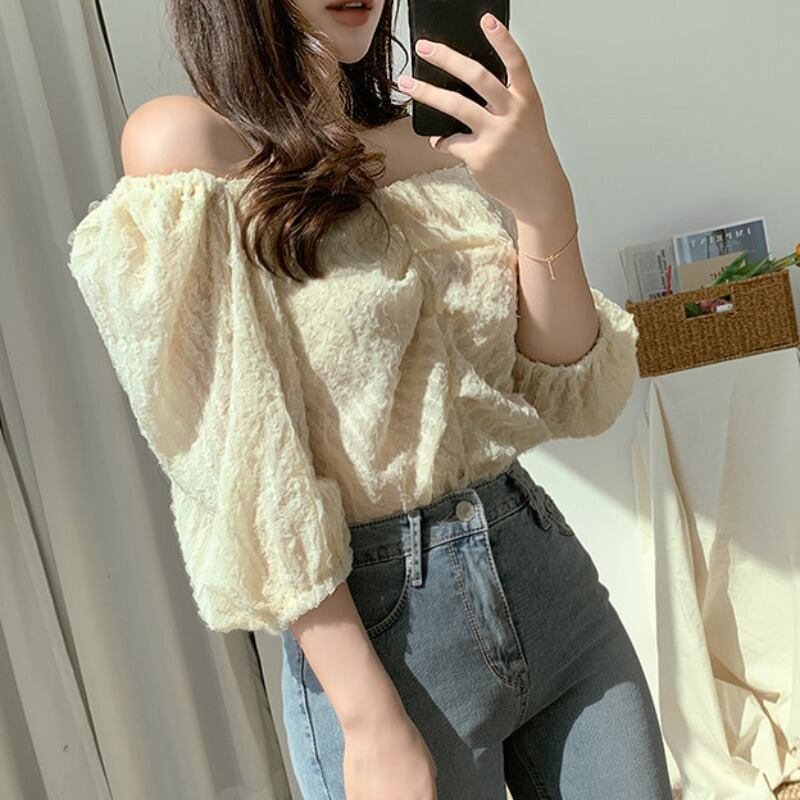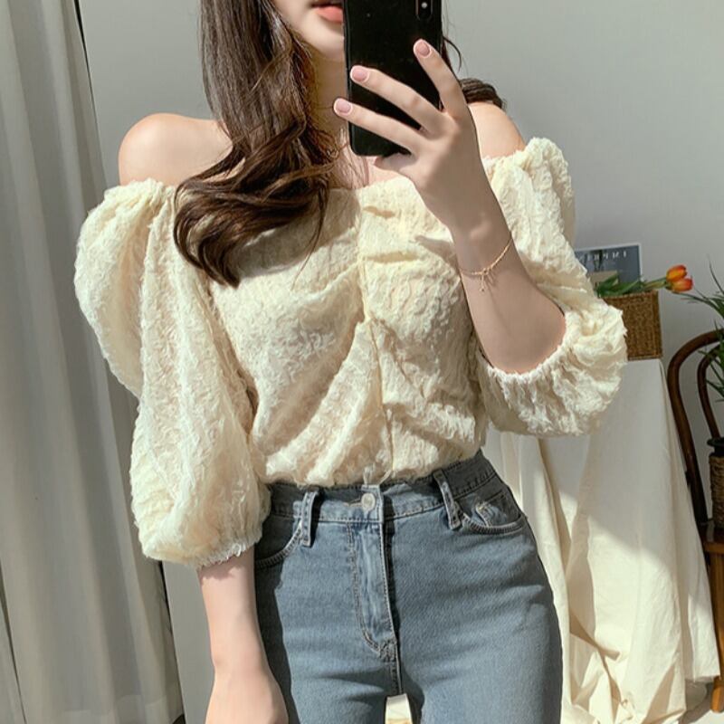 サマー薄手スリーブシャツ レディース ランタンスリーブ 大人ガーリー スウィート キュート カジュアル 夏物 オフショルダー ICC_レディース2977195