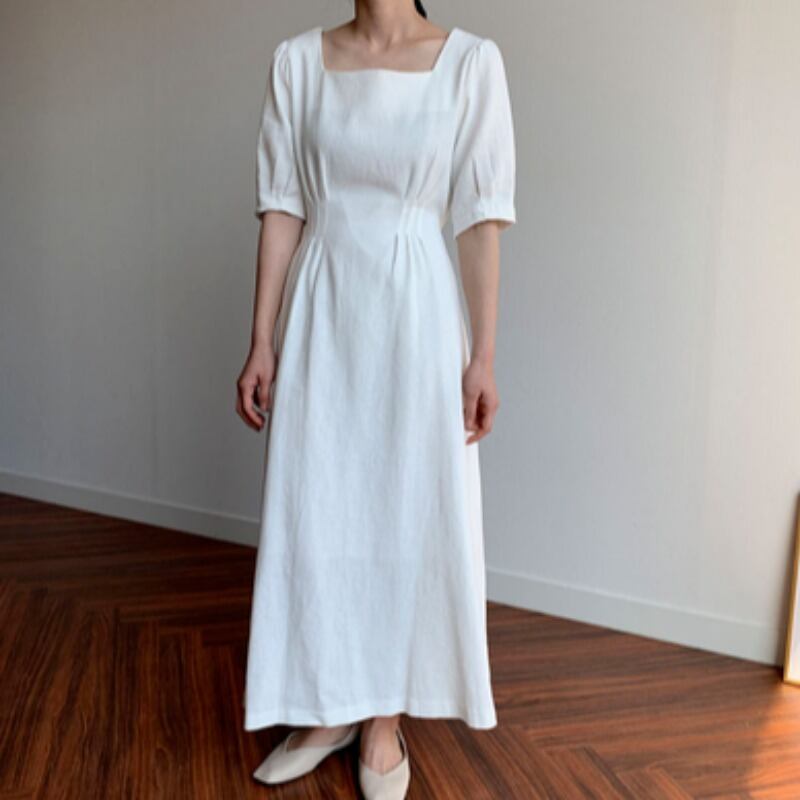 サマーソリッド カラーレースウェストロングスタンダード半袖スリーブドレス ショート レトロ ハーフスリーブ 夏物 ソリッドカラー スクウェア ICC_レディース8794378