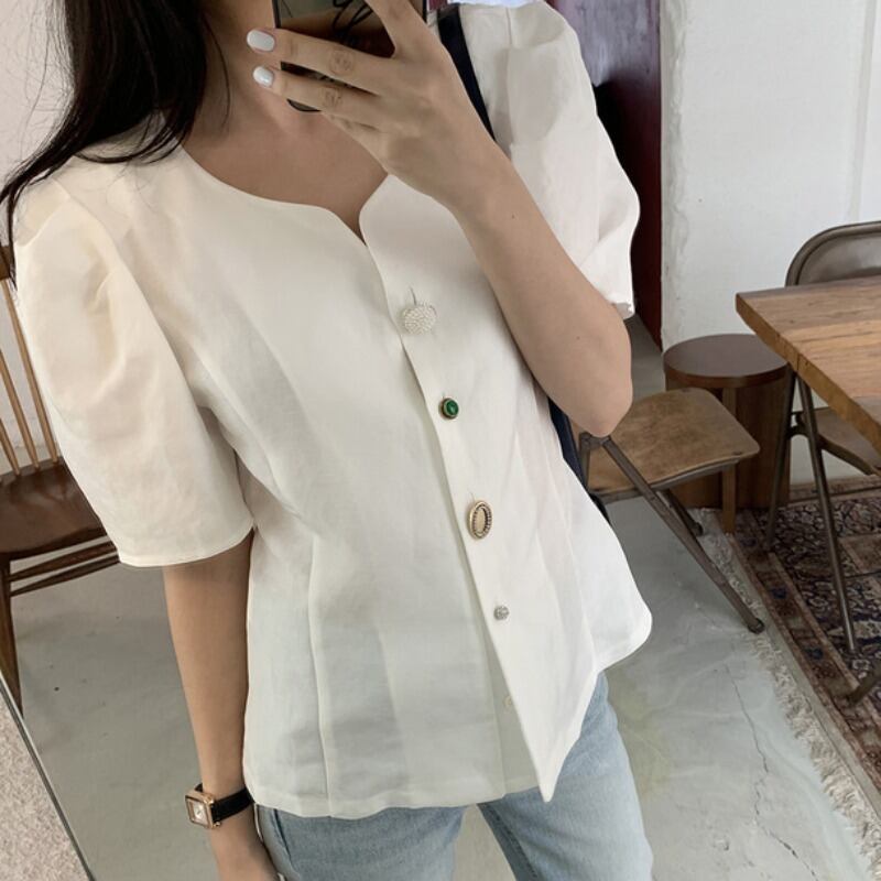 サマースタンダードバックルスリーブ半袖シャツ ジャケット ショート コットン レトロ ハーフスリーブ 夏物 ICC_レディース2340486