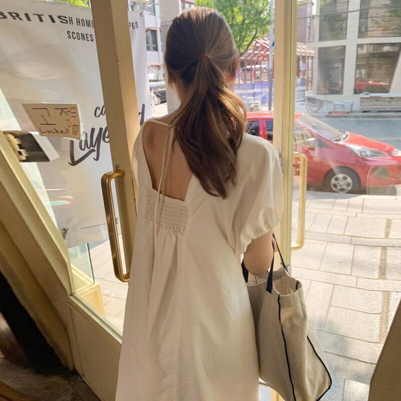 サマースタンダードカラースリーブ半袖ルーズホルターレースドレス ショート レトロ ハーフスリーブ エレガント 夏物 レースアップ スクウェア ICC_レディース7291377