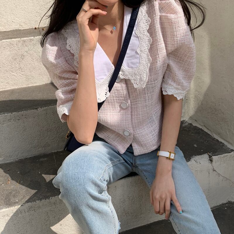 スタンダードシャツ サマーショートカラートップス ハイウェストウェスト レトロ 夏物 ICC_レディース2944536