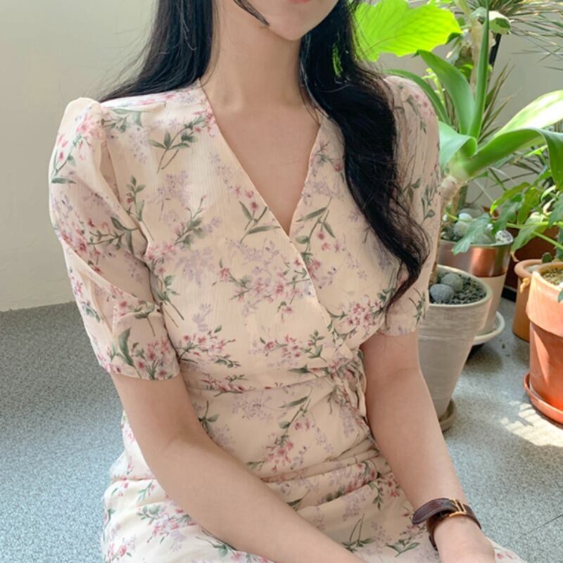 Vネックフローラルレースウェスト薄手スリーブシフォンドレス 花柄 レースアップ ICC_レディース9546027