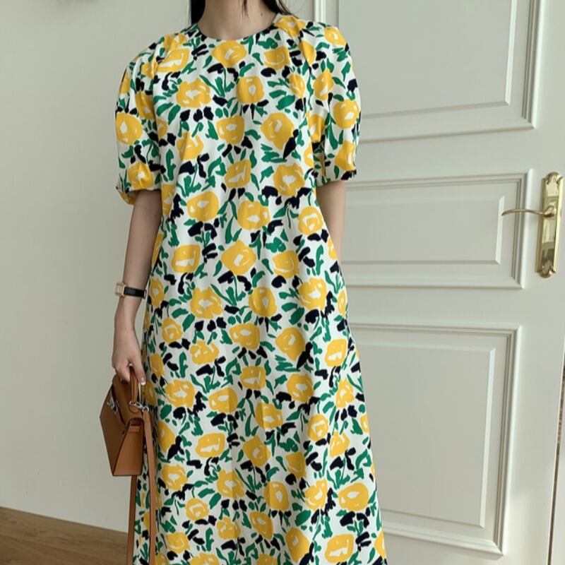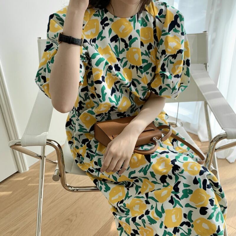 ヴィンテージフローラルドレス サマーホワイトルーズスリーブロングスカート 夏物 花柄 ビンテージ ICC_レディース6716874