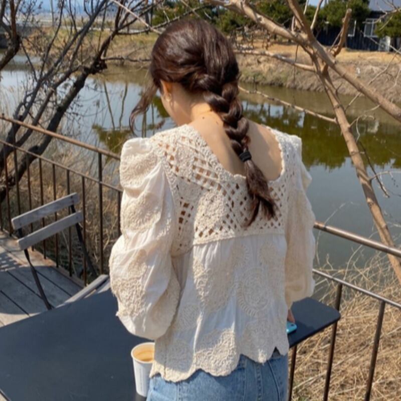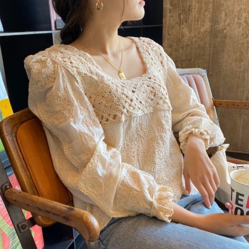 スタンダードカラーレースFlowerデザイン ルーズ長袖スリーブシャツ ロング レトロ フラワーデザイン スクウェア ステッチ ICC_レディース9480252